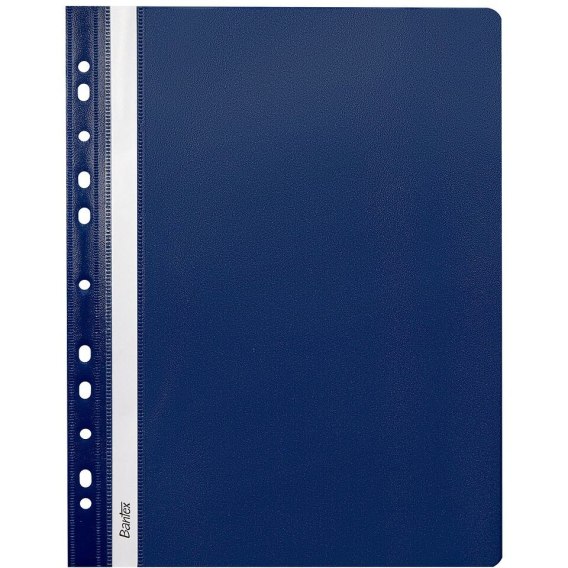 Klasyczne skoroszyty w formacie A4, wykonane z polipropylenowej folii. Przednia okładka o grubości 120 mic. jest przezroczysta dla doskonałej widoczności dokumentów. Tylna okładka o grubości 170 mic. została wykonana z nieprzezroczystej, granatowej folii. Metalowe wąsy bezpiecznie mocują dokumenty w skoroszycie. Na grzbiecie znajduje się wymienny pasek do opisu zawartości. Uniwersalna perforacja umożliwia wpięcie skoroszytów do każdego segregatora.