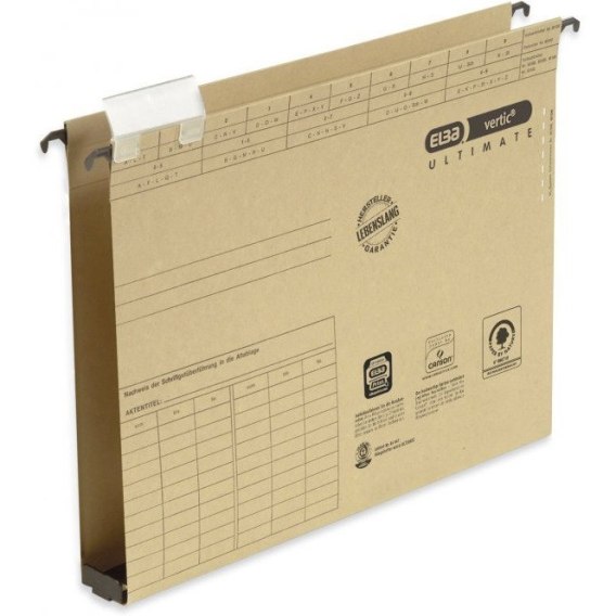 Teczki wiszące z poszerzanym dnem VERTIC ULTIMATE_- wykonane z mocnego kartonu CANSON o gramaturze 320 g/m__- wkładka plastikowa na dnie teczki z bocznymi ogranicznikami_- zwiększona pojemność i wytrzymałość_- przesuwny szyldzik z wymienna etykietą opisową_- dwie pary nacięć do pasków skoroszytowych E27592_- opakowanie - 25 sztuk_- dożywotnia gwarancja_- jednostka sprzedaży 1 opakowanie